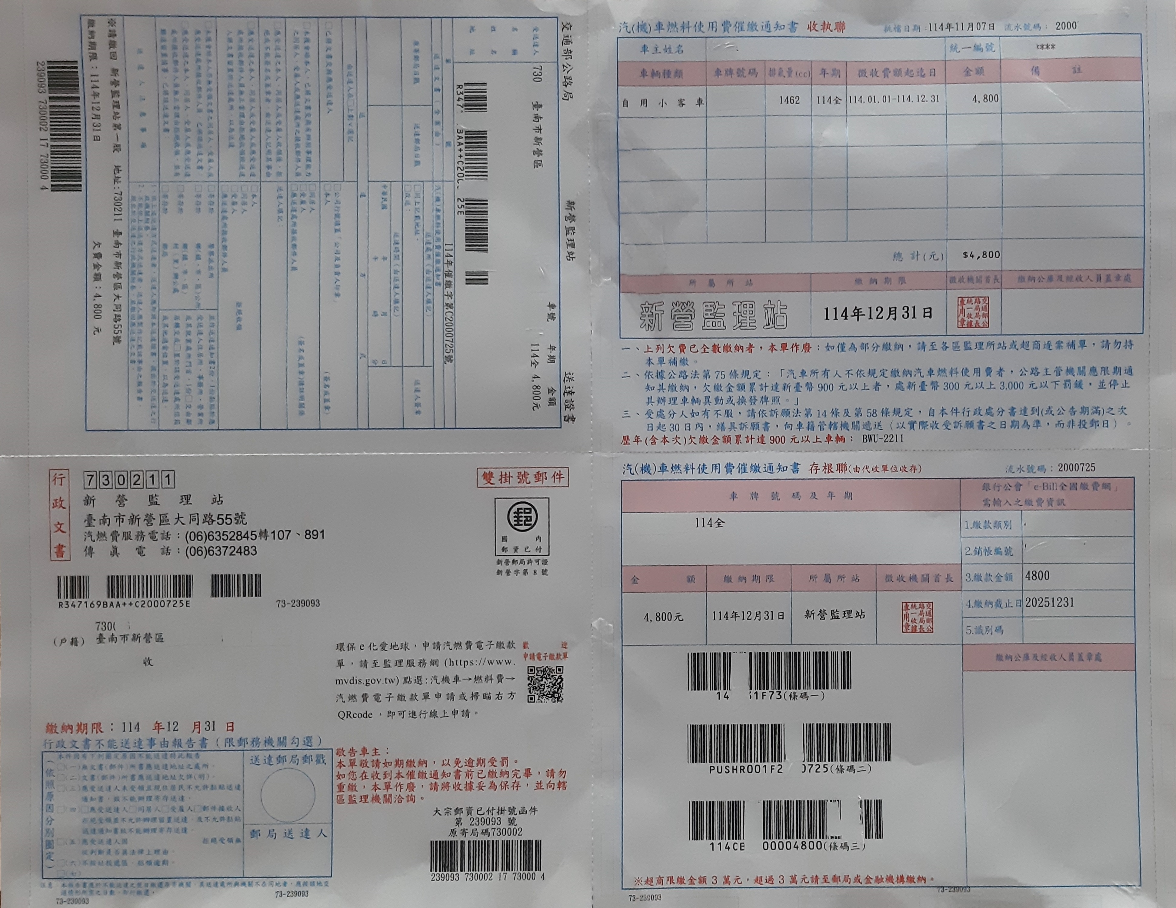 收到汽燃費雙掛號催繳通知書快快繳,以免逾期受罰